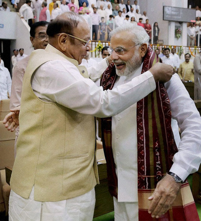 Prime Minister-elect and Gujarat Chief Minister Narendra Modi is greeted by Speaker Vaju Vala during the special session of the state Assembly in Gandhinagar on Wednesday. (Source: PTI)